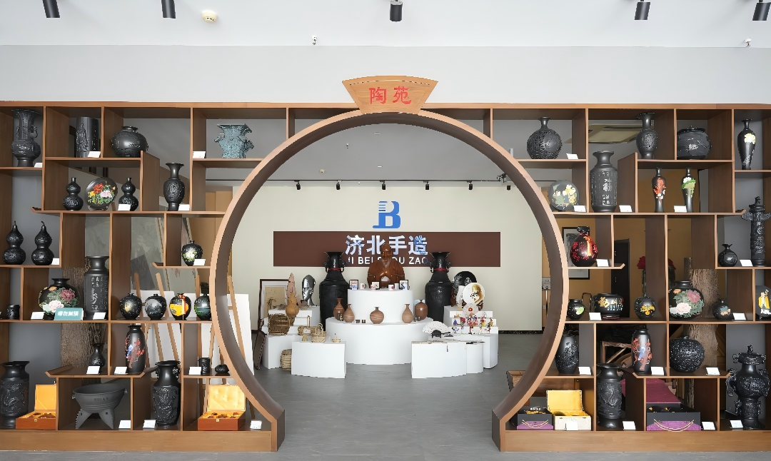 作為濟(jì)陽(yáng)區(qū)非遺文化的重要展示窗口,展廳始終以傳統(tǒng)技藝類產(chǎn)品為核心支柱。升級(jí)后,黑陶的古樸厚重、老粗布的經(jīng)緯溫情、木作的匠心巧思、剪紙的靈動(dòng)鮮活、柳編的自然質(zhì)樸,以及黃河五彩陶、刻瓷、烙畫、彩塑等十余項(xiàng)代表性非遺手造產(chǎn)品依舊悉數(shù)亮相,每一件作品都承載著當(dāng)?shù)亟橙藬?shù)十年的技藝沉淀,全方位呈現(xiàn)了非遺文化的深厚底蘊(yùn)與獨(dú)特魅力,讓觀眾在參觀中直觀感受傳統(tǒng)手造的文化溫度。